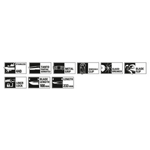 Dit volwassen eenhandsmes beschikt over een vergrendeling en een uitstekende "neus/flipper" bij de lemmetaanzet als aanvullende opener. Hierdoor kan het lemmet (440 rvs) in gesloten staat met de wijsvinger worden geopend. In geopende staat dient de "neus/flipper" als eenzijdig pareerelement en zorgt steeds voor een stevige grip. Het stevige, matzwarte lemmet met de gedeeltelijke kartelsnede onderstreept de stoere look van dit mes. De greep bestaat uit hoogwaardig aluminium. Levering inclusief riemetui van robuust Cordura-weefsel met vangriem.