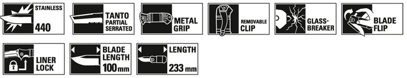 Dit volwassen eenhandsmes beschikt over een vergrendeling en een uitstekende "neus/flipper" bij de lemmetaanzet als aanvullende opener. Hierdoor kan het lemmet (440 rvs) in gesloten staat met de wijsvinger worden geopend. In geopende staat dient de "neus/flipper" als eenzijdig pareerelement en zorgt steeds voor een stevige grip. Het stevige, matzwarte lemmet met de gedeeltelijke kartelsnede onderstreept de stoere look van dit mes. De greep bestaat uit hoogwaardig aluminium. Levering inclusief riemetui van robuust Cordura-weefsel met vangriem.